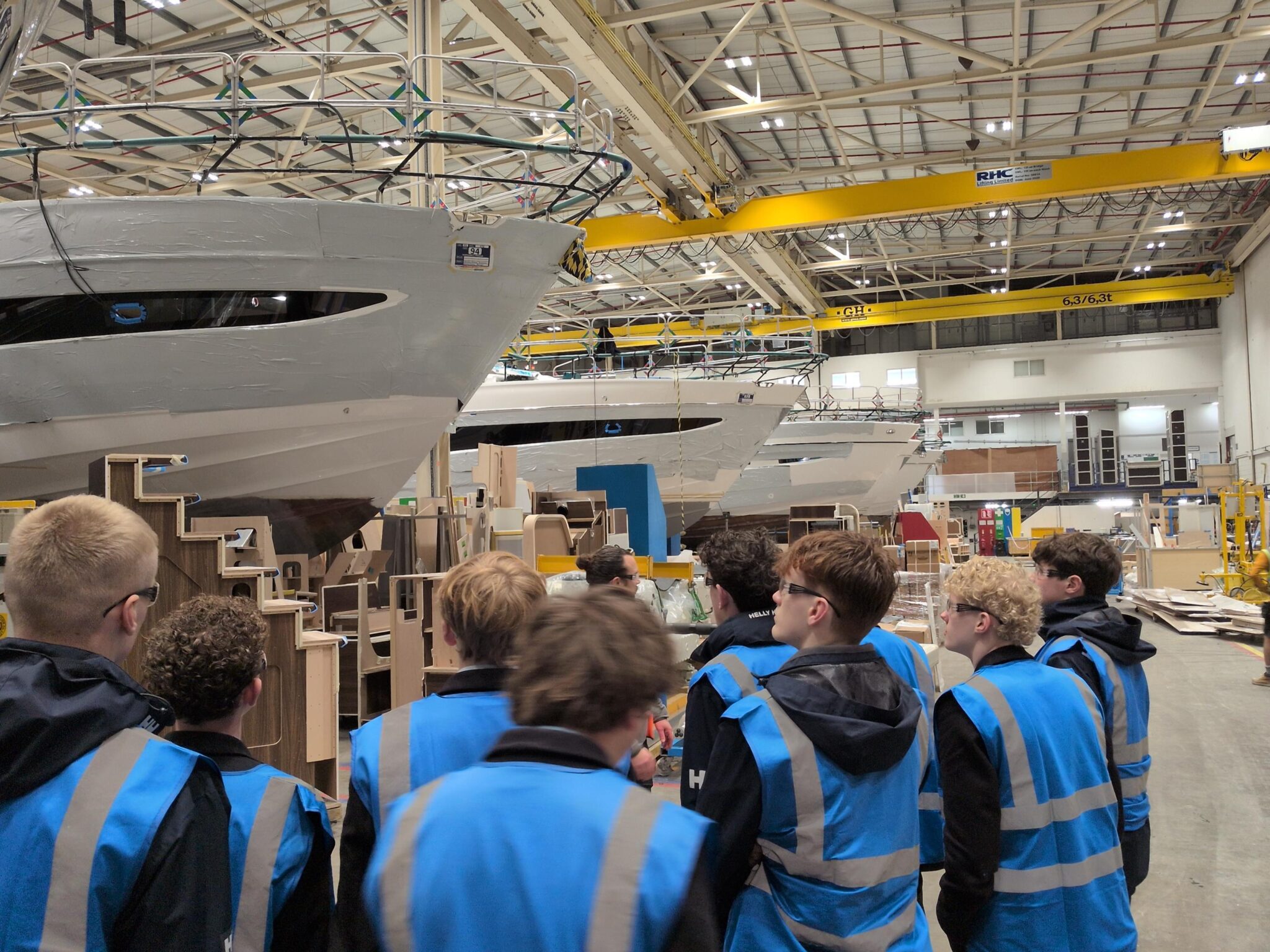 During the visit, yard manager Chris guided the group through the vast manufacturing sheds – more akin to aircraft hangars than traditional workshops – where pupils were able to witness the full breadth of modern manufacturing processes. These ranged from hand-crafted, job-production techniques to highly efficient steel-rail flow production lines, all contributing to the creation of beautiful luxury yachts for a global, multimillionaire clientele.
