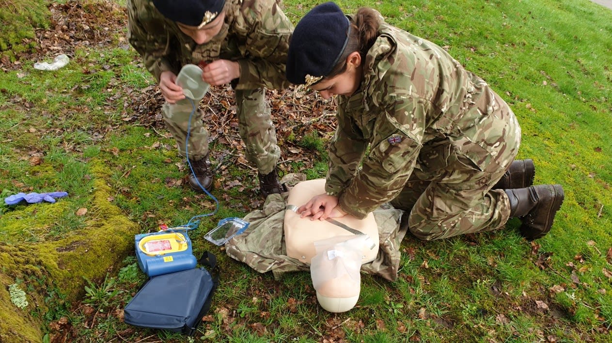 The CCF took part in a Casualty Simulation Exercise within the School grounds on Wednesday 4 March. The aim of the exercise was to test first aid and communication skills following recent sessions in the classroom and to earn the St John's Youth First Aid badge.  Truly harrowing scenes of exploding barbecues and chainsaw accidents, along with excellent acting skills from Miss Horton and the Senior Cadets saw the Year 10 cadets take on some valuable lessons about putting their First Aid skills to practical use.