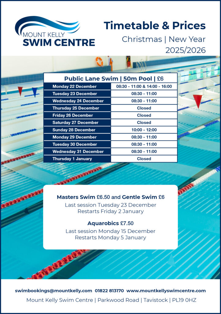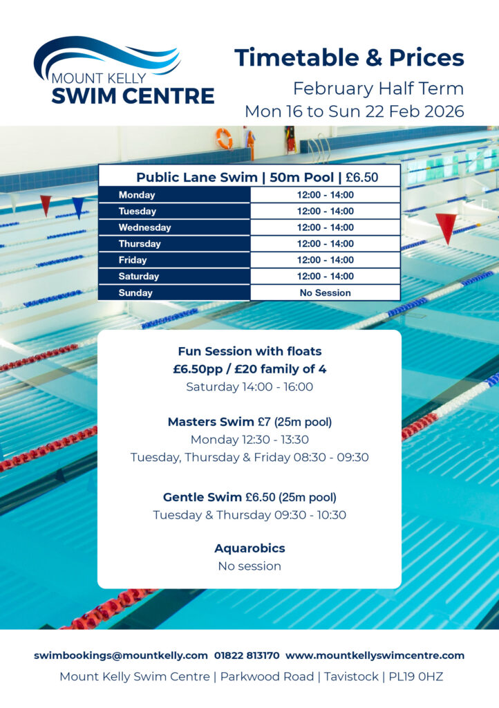 Welcome to the Mount Kelly Swim Centre. We have two indoor swimming pools, the Olympic Legacy 50m Pool and changing facilities were built in 2016. The pool features 8 lanes, Olympic starting blocks, underwater 5m sprint markings and a Pool Pod to assist with accessibility. We also have a 4 lane, 25m pool which is suitable for those learning to swim. Both pools have anti-wave lane lines. All sessions have lifeguards in attendance. We also offer free parking.