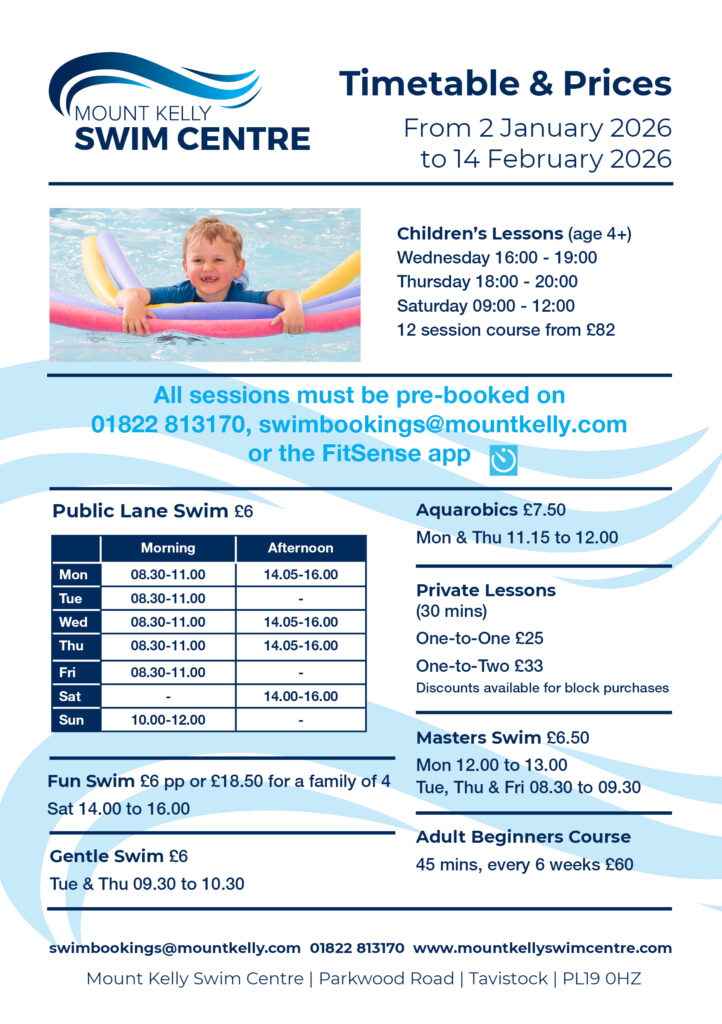Welcome to the Mount Kelly Swim Centre. We have two indoor swimming pools, the Olympic Legacy 50m Pool and changing facilities were built in 2016. The pool features 8 lanes, Olympic starting blocks, underwater 5m sprint markings and a Pool Pod to assist with accessibility. We also have a 4 lane, 25m pool which is suitable for those learning to swim. Both pools have anti-wave lane lines. All sessions have lifeguards in attendance. We also offer free parking.